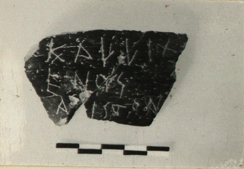 | Description: | Mended from two pieces. Fragment of large closed pot, black glazed, chipped, outside only. Incised outside: <graphic> | |