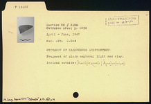 | Description: | Fragment of plain amphora. Incised outside: <graphic> Light red clay. | |