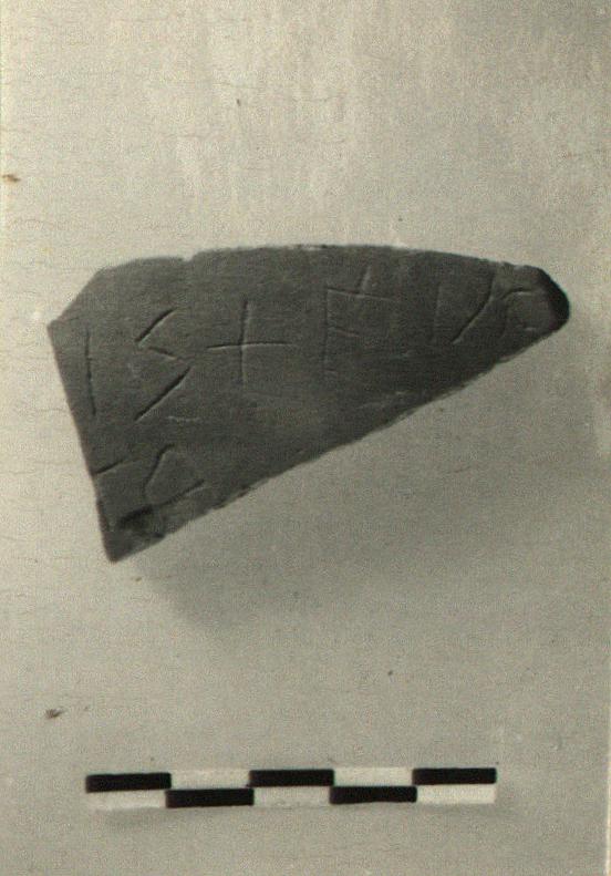 | Description: | Fragment of plain amphora. Incised outside: <graphic> Light red clay. | |