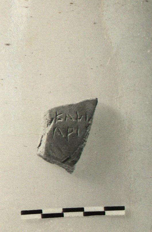 | Description: | Wall fragment from plain amphora. Incised outside: <graphic> Pinkish-buff clay. | |