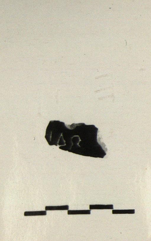 | Description: | Small wall fragment from black glazed kylix. Incised outside: <graphic> Very good glaze. | |