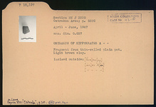 | Description: | Fragment from thin-walled plain pot. Incised outside: <graphic> Light brown clay. | |