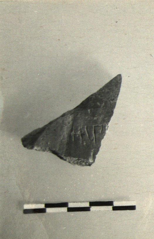 | Description: | Fragment from wall of semi-glazed krater. Incised outside: <graphic> Red glaze inside; thin red wash outside. | |