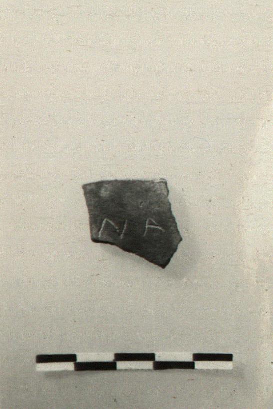 | Description: | Small fragment of cooking ware pot. Incised outside: <graphic> Thin fabric with white bits. Gray clay, red at inner surface. | |