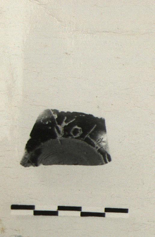 | Description: | Joins P 18484. Fragment of salt cellar, flat-bottomed with rounding walls. Incised inside and out: <graphic> Black glaze except on bottom. | |