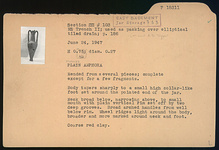 | Description: | Mended from several pieces; complete except for a few fragments. Body tapers sharply to a small high collar-like foot set around the pointed end of the jar. Neck broad below, narrowing above, to small mouth with plain vertical rim set off by two deep grooves. Broad arched handles from below rim. Wheel ridges light around the body, broader and more marked around neck and foot. Coarse red clay. | |