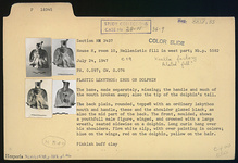 | Description: | The base, made separately, missing; the handle and much of the mouth broken away; also the tip of the dolphin's tail. The back plain, rounded, topped with an ordinary lekythos mouth and handle, these and the shoulder glazed black, as also the mid-part of the back. The front, moulded, shows a youthful male figure, winged, and crowned with a large wreath, seated sidewise on a dolphin. Long curls hang over his shoulders. Firm white slip, with over-painting in colors: blue on wings, red on the dolphin, yellow on the hair. Pinkish-buff clay. | |