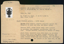 | Description: | Mended from several pieces; complete except for fragment of neck and rim, and minor chips. Echinus foot, plump ovoid body; neck concave in profile; rim rounded, projecting, flat on top. Rolled handles, shoulder to middle of neck. Above foot, reserved zone with rays; on shoulder below neck, front and back, tongue pattern, the tongues alternately red and black. Around the neck, linked lotus buds and flowers, all outlined with incision. The hearts of the buds red, of the flowers white. Glazed inside to the base of the neck; the top of the lip reserved. A circle of grayed glaze under one handle and a circular patch on the front; contact with other vases in the kiln? | |
