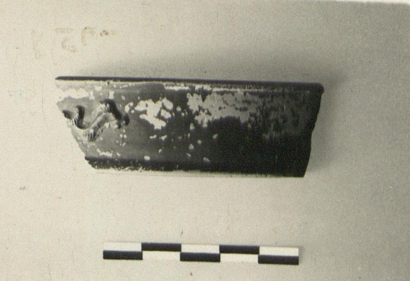 | Description: | Rim fragment from a large Sigillata plate with vertical rim. In applied relief, a small dolphin, right. Buff clay; dull red glaze somewhat peeled. ADDENDA Fragments added from sherds give more of the rim, and part of the floor, with start of foot. Relief decoration: Eros, carrying a cornucopia(?), left; and a second dolphin. On the floor, incised concentric circles, a rouletted band between the outer pair. | |