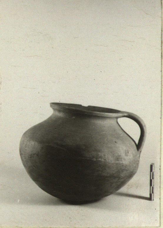 | Description: | Complete except for small chips. Squat round-bottomed cooking pot with round mouth and one handle from rim. Micaceous cooking ware fabric; handmade. | |