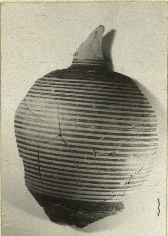 Description:   Mended from many fragments. Part of one side preserved, from above the foot to the shoulder, and with a fragment of the neck. Nothing of base or rim. Shoulder and area above foot glazed; rest of body banded. On the neck, diminishing triangles, a cross at the middle and zigzags to one side.
