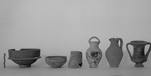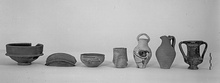 | Description: | Chip of rim missing; otherwise unbroken. Small ring foot; plain vertical rim. Light brownish-buff clay; very thin dull red glaze wash, on inside and upper part of outside, running down onto lower part. | |
