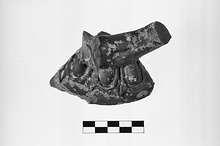 Description:   Shoulder fragment with the attachment of one handle, from a large pot, krater? On the shoulder, in high relief, egg and dart. The end of the handle is finished with a small rotelle.