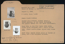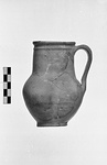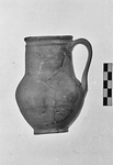 | Description: | Mended from several pieces; about one-third missing at the back, including the handle except for the lower attachment. Restored in plaster. Eggy body on low flat base; wide neck; round mouth finished with a small rolled rim. Light handle-ridge around neck below rim. Buff clay; smeary black glaze on inside of neck, and a few splashes outside. | |
