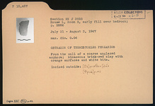 | Description: | From the wall of a coarse unglazed amphora. Incised outside: <graphic> Micaceous brick red clay with orange surfaces and white bits. | |