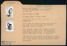 | Description: | About half the body and more than half of the neck and rim missing; the profile complete, with the handle. Flat bottom; plump body; nearly straight neck with rim flat on top and slightly projecting; round mouth. Rolled handle, rising from face of lip, to shoulder. Pinkish-buff clay, unglazed except for inner and outer faces of neck, outer face of handle, and a band around the body below the handle attachment. | |