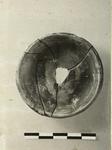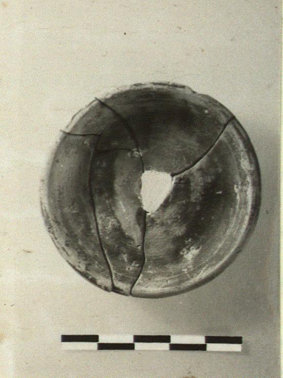 | Description: | Mended from several pieces; small chip missing. Roughly wheelmade with flat bottom and low spreading wall. Thin dull glaze, red to black, over all, much worn. P 18550 - P 18553 are similar in shape and fabric. | |