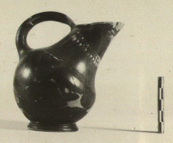 Description:   Small fragments restored. Low flaring ring foot; round body; long wide neck. Rolled horizontal handle from shoulder to back of mouth. Around the neck, a necklace with pendents, in thinned clay paint.