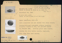 | Description: | Both casserole and lid mended from many pieces. Convex-bottomed casserole without handles; slightly flared at rim, and grooved inside to receive lid. Streaky glaze wash inside. Convex lid with button handle, unglazed. Very fine thin buff fabric. | |