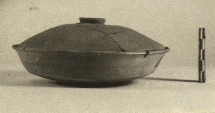 | Description: | Both casserole and lid mended from many pieces. Convex-bottomed casserole without handles; slightly flared at rim, and grooved inside to receive lid. Streaky glaze wash inside. Convex lid with button handle, unglazed. Very fine thin buff fabric. | |