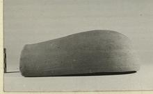 | Description: | About half preserved with all of one edge and corner and part of the curved end. One string hole preserved at the open end. Micaceous cooking ware fabric, unglazed and undecorated. | |