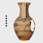 Description:   The body broken on one side; several fragments missing. Ring foot and trefoil mouth; slender ovoid body. The body glazed, with three reserved bands decorated with triple lines. Panel on neck, bordered above and below by triple lines; between, simple key pattern, quadruple.