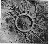 | Description: | The bottom preserved and a small part of the rim and wall. Restored in plaster. Medallion, large rosette. A ring of small leaves around; then a zone of triangular leaves; above this, the wall is covered with large triangular leaves, overlapping, those of the lower zone tapering below to broad stems. Upper zone, lightly raised band between two raised lines; no ornament. Glaze dull black inside and around upper part of outside; dull red below. | |