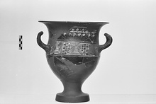 | Description: | Many fragments preserving much of rim, body, and part of both handles; nothing of foot preserved. Restored in plaster. Small bell krater with high, flaring rim, low rounded body, incurved round handles. Three scraped grooves bordering and separating bands of pattern. Decoration in clay paint and thick white: below rim double row of grape vine with clusters in white. In handle zone concentric rectangles alternating with black and white checkerboard panels. Dull black glaze inside and out, shading to red at bottom. | |