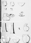 | Description: | Mended from several pieces; part of rim and wall missing. Deep bowl, the sides tapering to small rounded bottom. Plain rim. Black glaze, somewhat metallic, over all; two scraped grooves below the rim, inside and out. | |