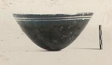 | Description: | Mended from several pieces; part of rim and wall missing. Deep bowl, the sides tapering to small rounded bottom. Plain rim. Black glaze, somewhat metallic, over all; two scraped grooves below the rim, inside and out. | |