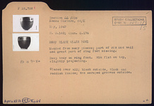 | Description: | Mended from many pieces; part of rim and wall and great part of ring foot missing. Restored in plaster. Deep body on ring foot. Rim flat on top, slightly projecting. Glazed over all; black outside, black and reddish inside; two scraped grooves outside. | |