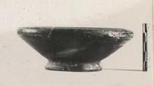 | Description: | Mended from five pieces; part of floor missing. Small deep bowl on flaring ring foot; incurving rim. Black glaze over all. Cf. P 26154, P 11452. | |