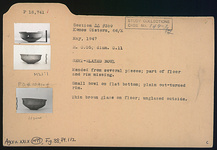 | Description: | Mended from several pieces; part of floor and rim missing. Restored in plaster. Small bowl on flat bottom; plain out-turned rim. Thin brown glaze on floor; unglazed outside. | |