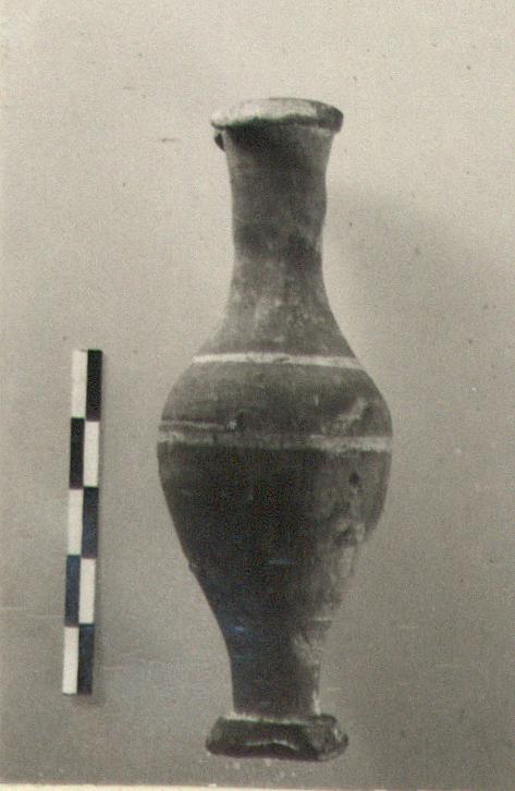 | Description: | Intact except for part of rim. Dropped rim; disk foot. Fusiform. Three bands of white paint, one on neck, two on body. Gray-buff clay. | |