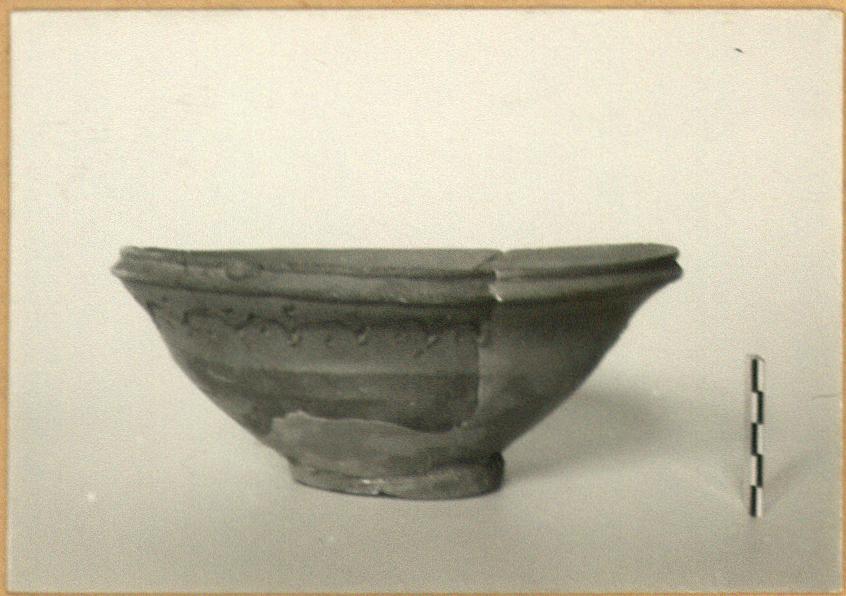 Description:   Mended from several pieces; large fragments of wall and rim missing. Restored in plaster. Bowl with small ring foot, flaring, slightly rounded sides, thickened rim with wide groove on outer face. Wide scalloped line incised below rim on outside; punched dots above and below.