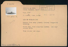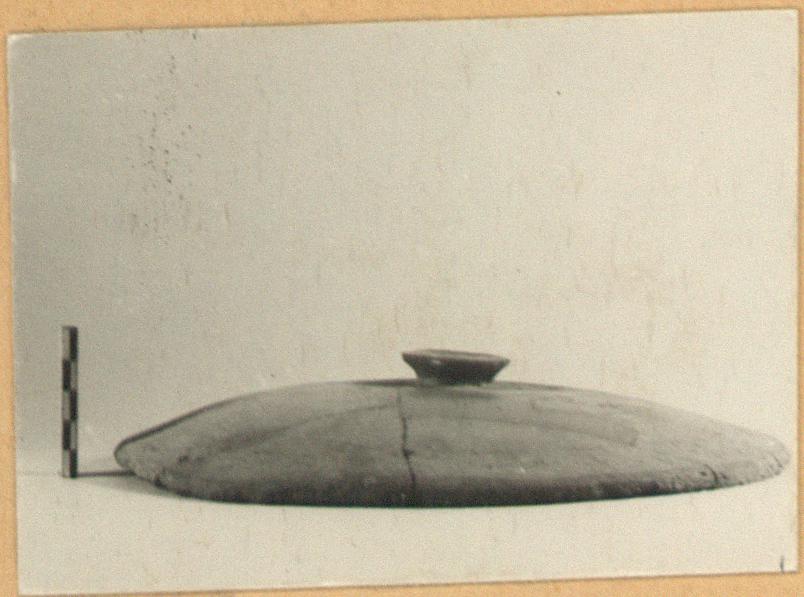 | Description: | Mended from many pieces; several fragments missing. Round lid, very slightly convex; low cup-shaped knob. Very coarse red clay. | |