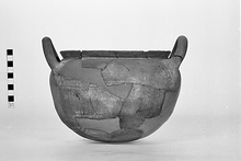 Description:   Mended from many pieces; large fragments of wall missing. Round-bottomed pot with high shoulder curving in slightly to straight, flaring rim. Large, vertical, rolled handles.