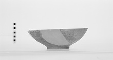 | Description: | Three fragments preserve bottom and section of wall and rim. Restored in plaster. Large, rather shallow bowl with sides curving slightly from plain rim to small foot. Very coarse clay, reddish outside, blackened irregularly inside; very heavy fabric. | |