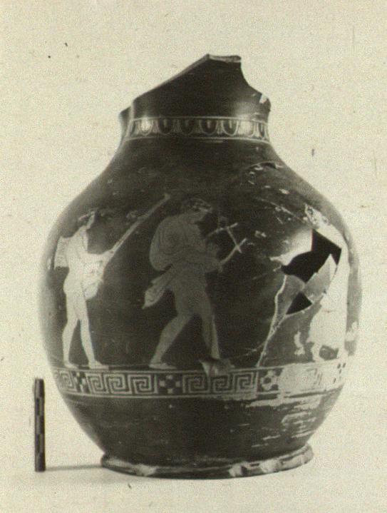 | Description: | Mended from many pieces; the lip, handle, most of the upper part of the neck, and fragments of body and foot missing; restored in plaster. Missing from the figured scene, part of the body and arm and stick of the left-hand figure. Plump body; rounded ring foot. The figured scene bordered above by egg and dart, below by maeander and checkerboard; reserved line at either side. Komos: a wreathed bearded man in a himation walks to right, his head back, his lips parted in song, his right arm stretched out behind him with his stick. Two youths, with wreaths and fillets, follow: a lyre player, himation on his shoulders, his head inclined forward; and a nude youth with torch, oinochoe, and a box on his back. Partial relief contour on all three. Dilute glaze for side locks and part of beard of man; side locks and back hair of lyre player, also his right knee and great trochanter. White for the fillets and torch flame. Traces of preliminary sketch on the bodies and legs of the youths, by which they had the left foot foremost. Pinkish-buff clay. Glaze lustrous in parts but thin on neck above figured scene, and at back below handle: worn in places, including some figure-details. Thin wash inside. | |