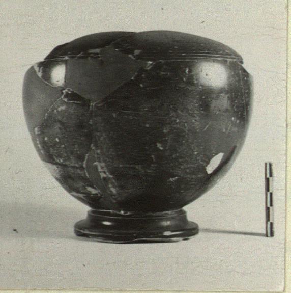 | Description: | The lower part only preserved, mended from many pieces, with a part of the shoulder and the trace of the handle attachment. Broad, rather squat ovoid body with well-defined shoulder, its turn marked by a band of three incised lines. Elaborately moulded ring base. Good glaze, red to black; somewhat worn. The inside unglazed. | |