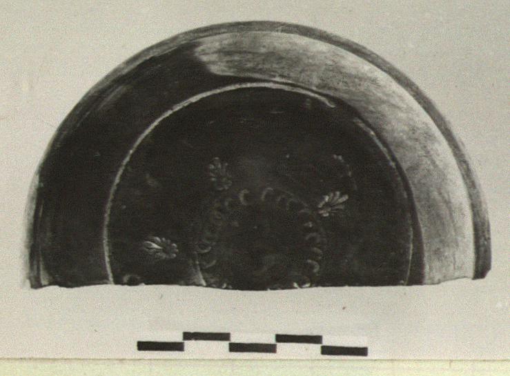 Description:   A single fragment preserves rather more than half. Small open bowl with slightly thickened rim. Ring foot, with concave moulding on inside. On the floor a ring of ovules with palmettes around.