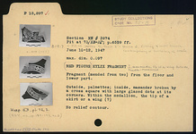 Description:   Fragment, mended from two, from the floor and lower part. Outside, palmettes; inside, maeander broken by a cross square with large glazed dots at its corners. Within the medallion, the tip of a skirt or a wing(?). No relief contour.