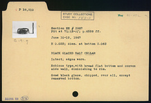 | Description: | Intact; edges worn. Echinus type, with broad flat bottom and convex side wall, diminishing to rim. Good black glaze, chipped, over all except reserved bottom. | |