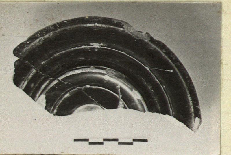| Description: | Nearly half the floor, with the start of the side wall, set in from the projecting edge, preserved. The bottom elaborately moulded, with a very low ring foot, worn on resting surface. Good black glaze over all; center of bottom reserved. | |