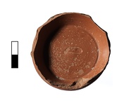 | Description: | A single fragment preserves foot and some of lower body of a Samian bowl. At center of floor a foot stamp, apparently without letters. On bottom a graffito: <graphic> Micaceous cinnamon clay and glaze. | |