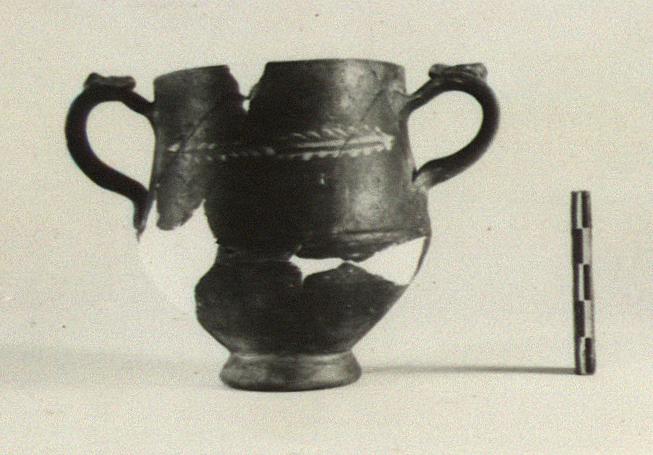 | Description: | Small fragments of body and rim missing. High ring foot; rounded lower wall; the upper wall slightly concave, finished with plain rim; a shallow groove at the junction of the two parts. Vertical band handle, set below rim; plastic masks as thumb-rests. Dull black glaze over all. A garland in thinned clay paint in the handle zone on either side. | |