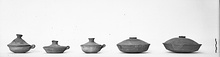 | Description: | Mended from many pieces; fragments missing. Similar in shape and decoration to P 19053 (ΝΝ 4162). ADDENDA P 19053: Shallow bowl with gently rounded bottom and slightly flaring wall; the rim slightly out-turned and grooved on the inside to take the lid. Low domed lid with low knob handle, concave at the center and grooved around its edge on top. Glazed inside only, to the rim. | |