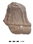 | Description: | Rim fragment from a very large brazier; edge at top broken away; face missing. Lug with bearded head. A thick curl on either side of the head; finer lines above for hair. Large egg and dart moulding on outside, just below level of rim. Very coarse gritty micaceous fabric, brownish to gray. Traces of light slip. | |