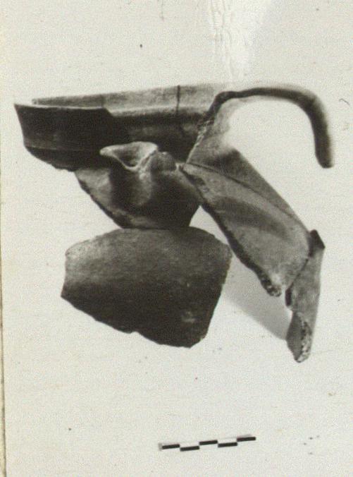 | Description: | Most of handle and spout and most of rim, with part of wall, preserved; mended from many pieces. Restored in plaster. Deep, slightly angular body; moderately wide mouth with plain vertical rim, lightly collared outside and ridged inside to hold lid; band handle from rim; on the shoulder, set vertically close to the rim, a short pierced spout with trefoil lip. Wheel made of moderately thick cooking ware fabric, fired gray. | |