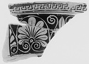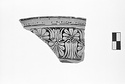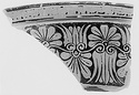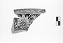 Description:   Two fragments from opposite sides of the rim of a red figure volute krater. Lip flat on top, projecting; its outer face decorated with a single maeander.